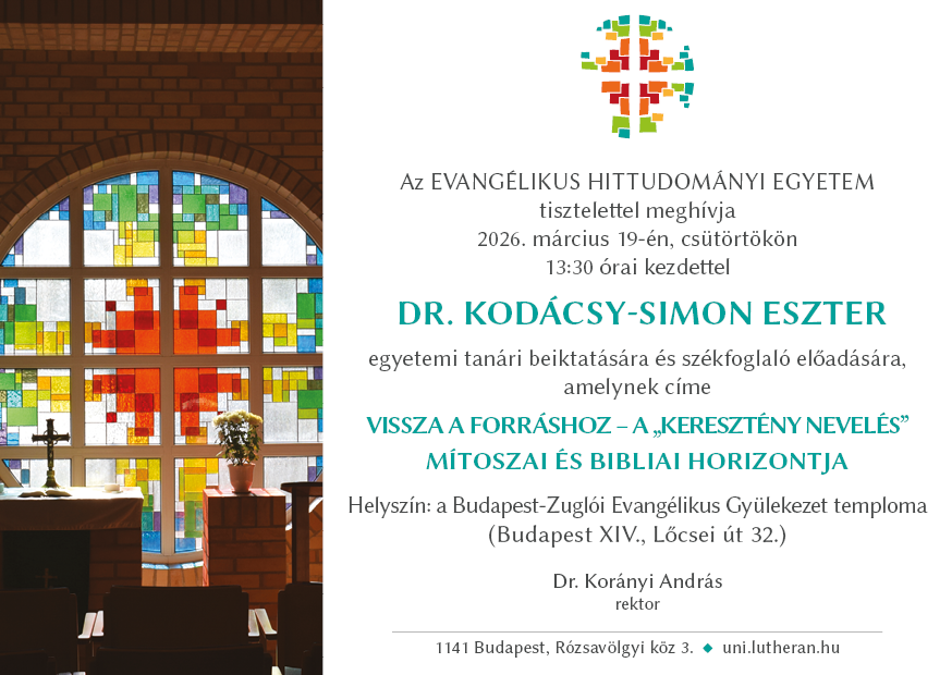 Az Evangélikus Hittudományi Egyetemen 2026. március 19-én, csütörtökön 13:30 órakor kerül sor Dr. Kodácsy-Simon Eszter egyetemi tanári beiktatására.