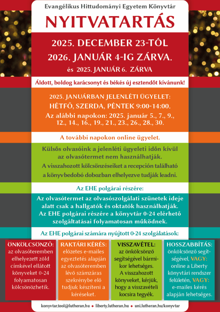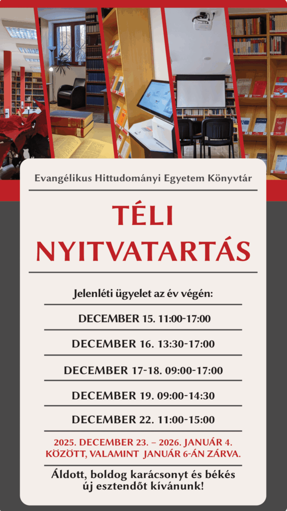 A könyvtár online szolgáltatásai továbbra is működnek. Kérdés esetén munkaidőben a konyvtar.teol@lutheran.hu címen állunk rendelkezésre.